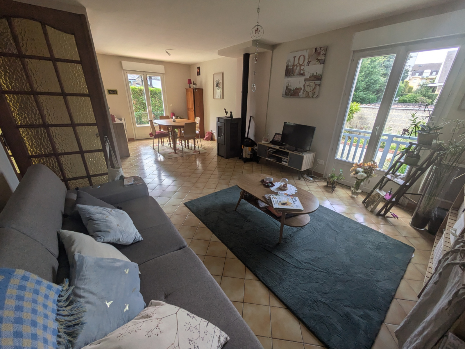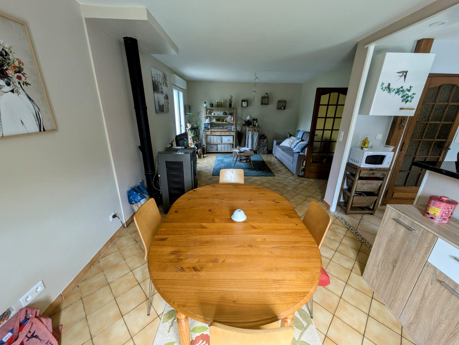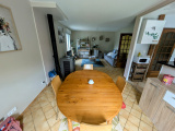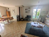 Une entrée, un séjour-salon avec poêle à granules, cuisine ouverte aménagée et équipée, 3 chambres, salle d'eau, wc.