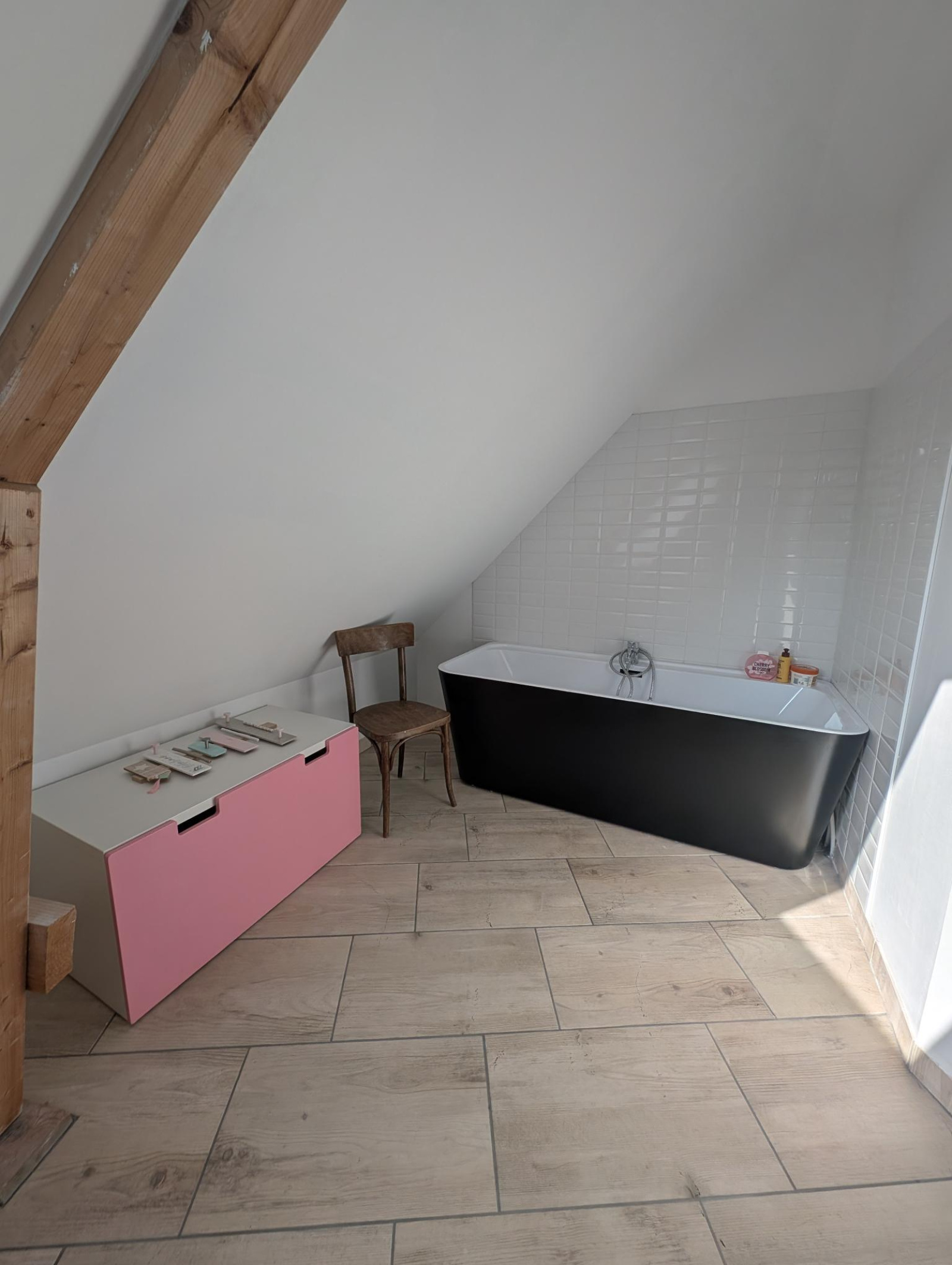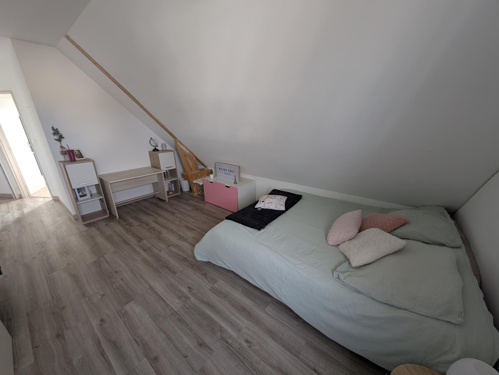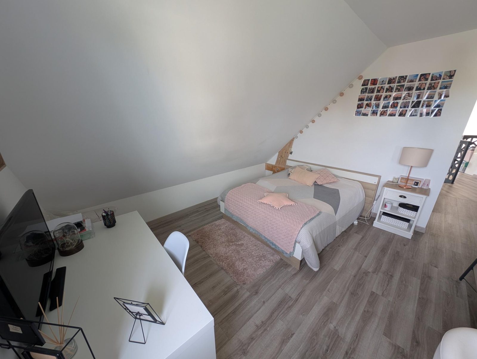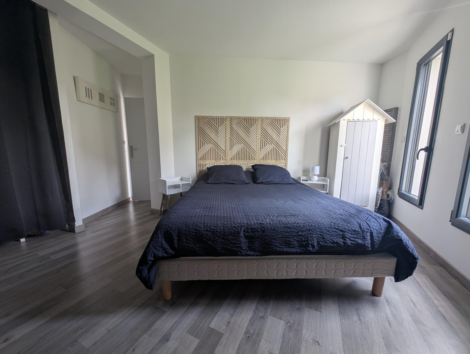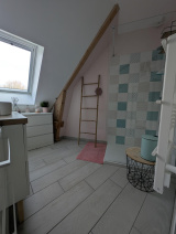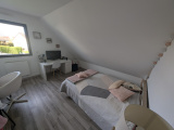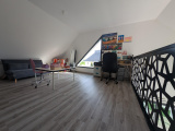 A l'étage: une grande mezzanine / bureau / pièce loisir, une grande chambre avec salle de bains privative, une grande chambre avec salle d'eau privative, un wc indépendant.